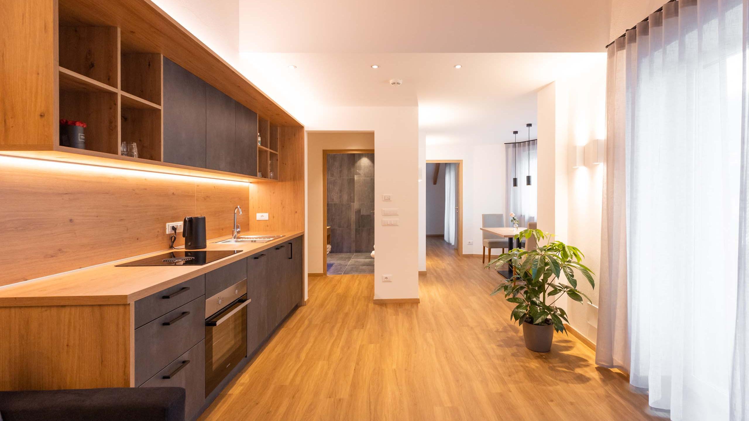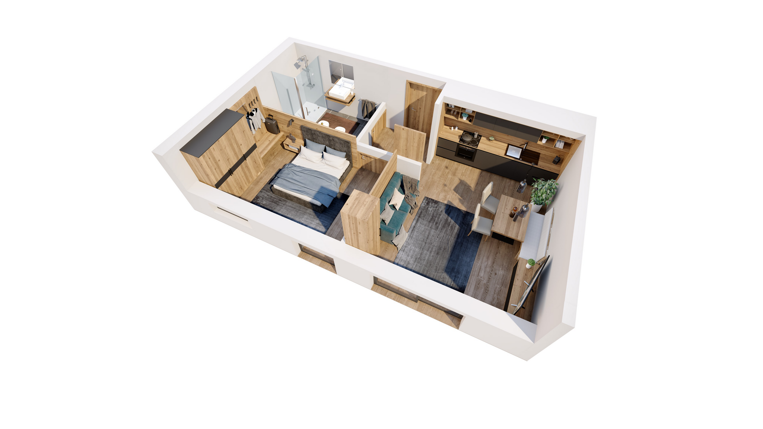 Would you like a little more? Voilà: bedroom for two with comfortable box-spring bed, combined living room and kitchen with cosy sofa bed offering space for two additional people, separate bathroom with shower, and balcony. The kitchen is fully equipped with fridge and freezer, oven, dishwasher, and Bora stovetop. Ready to enjoy with bath towels, bed linen, and kitchen linen. A garage parking space is available free of charge. Breakfast for two people can be added to your booking for €18.00 per person.